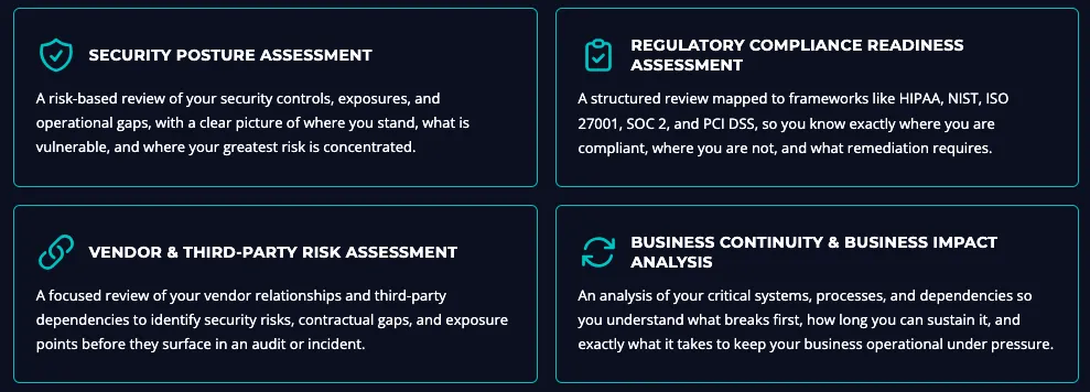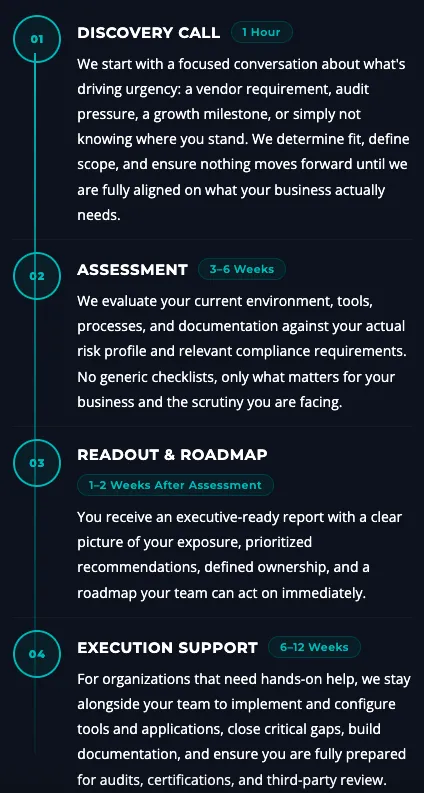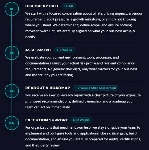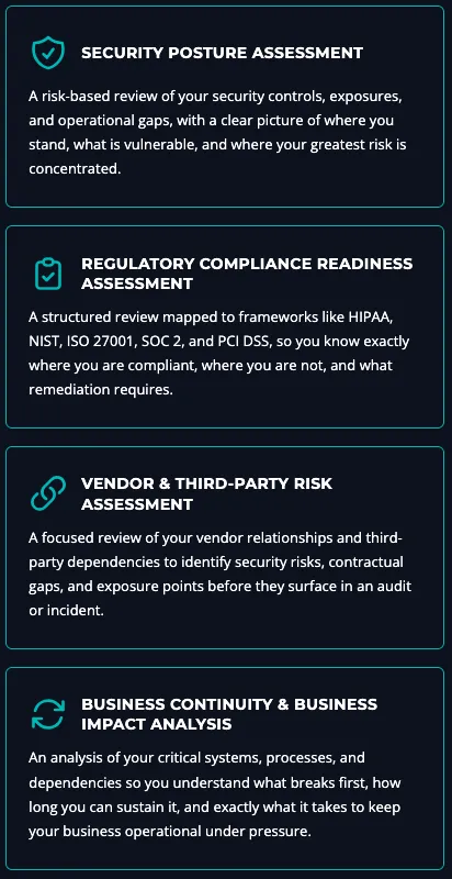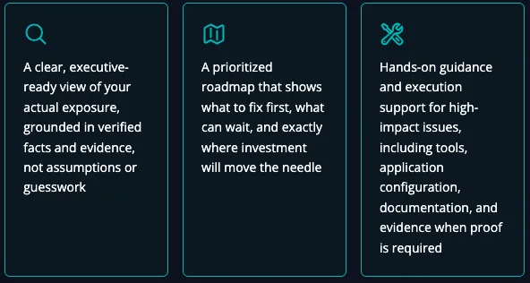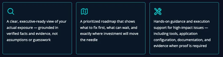 You get a practical roadmap, clear ownership, and implementation-ready next steps, plus audit and attestation support when needed.